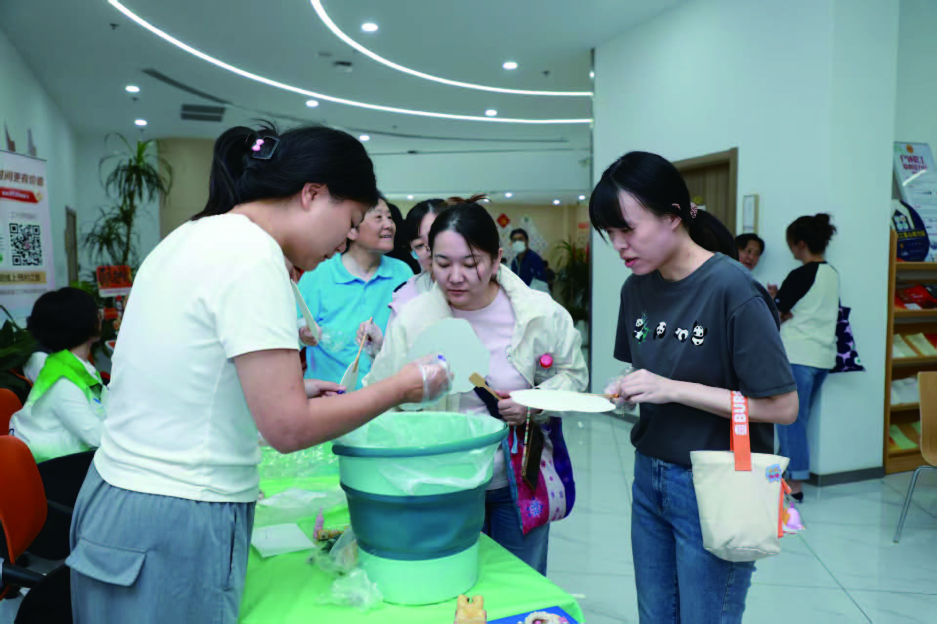 当天,一楼大厅设立了“文明实践市集”,各街镇布置的特色展位如漆扇制作、金融防诈宣传等吸引了众多市民参观、互动和体验。