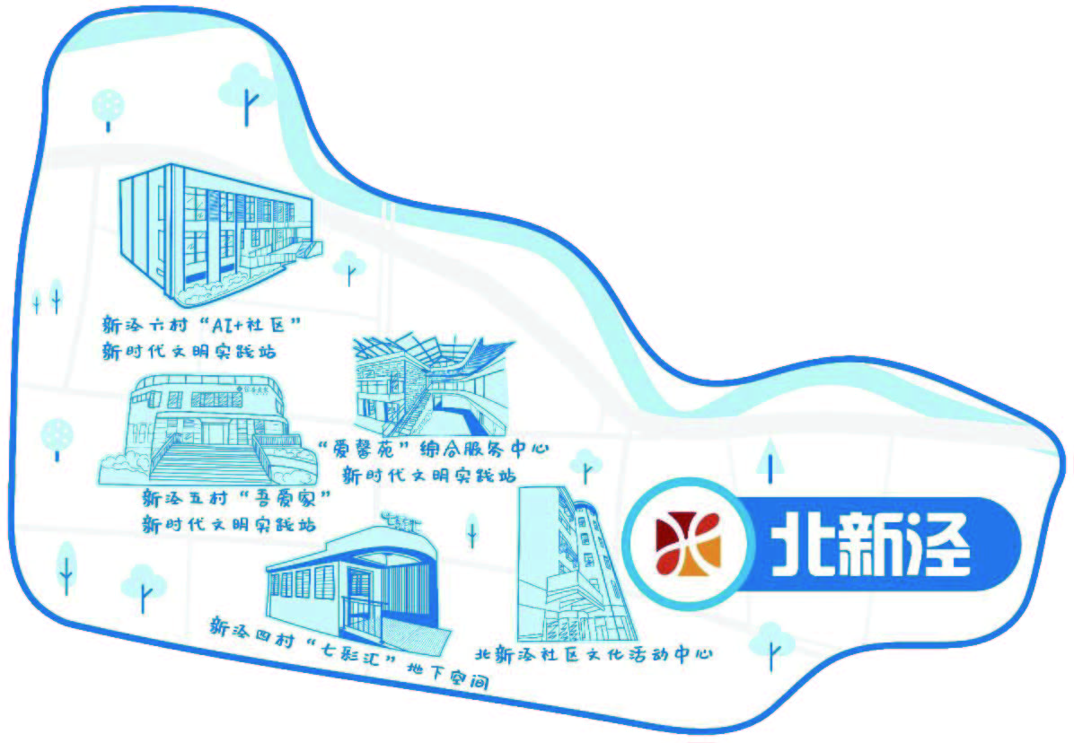 北新泾街道推出了“文明实践五大亮点”:社区文化活动中心展现“文化聚力”;新泾四村“七彩汇”地下空间体现“多元融汇”;新泾五村“吾爱家”新时代文明实践站凸显“生态共生”;“爱馨苑”综合服务中心提供“智慧康养”;新泾六村“乐爱家”新时代文明实践站展现“绿色智治”。
