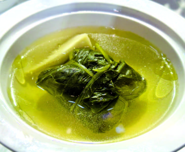 甲鱼是江南民间特别看重的滋补佳品,苏州人遵循不时不食的规矩,以春季油菜花初开时的“菜花甲鱼”与秋季桂花盛开时的“桂花甲鱼”最合食用。品种有生炒甲鱼、酱炒甲鱼、烂糊甲鱼、汤煨甲鱼等。厨师选用三斤以上的汉寿甲鱼,一只甲鱼斩件四块,每块带脚,搭配裙边、蹄膀、腊肉以及大蒜、笋尖等,煨煮五小时以上。青盐是大颗粒咸水湖原生盐,矿物质丰富,盐香味纯,炖汤有提味去腥之功效。此菜肉质酥烂,汤汁浓郁,胶质封唇,食之滋补养生。